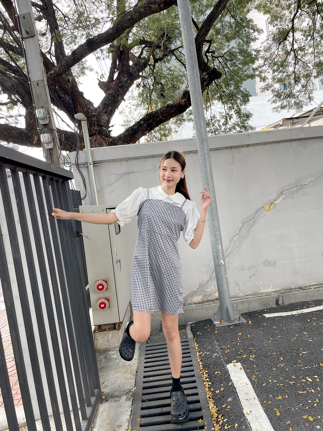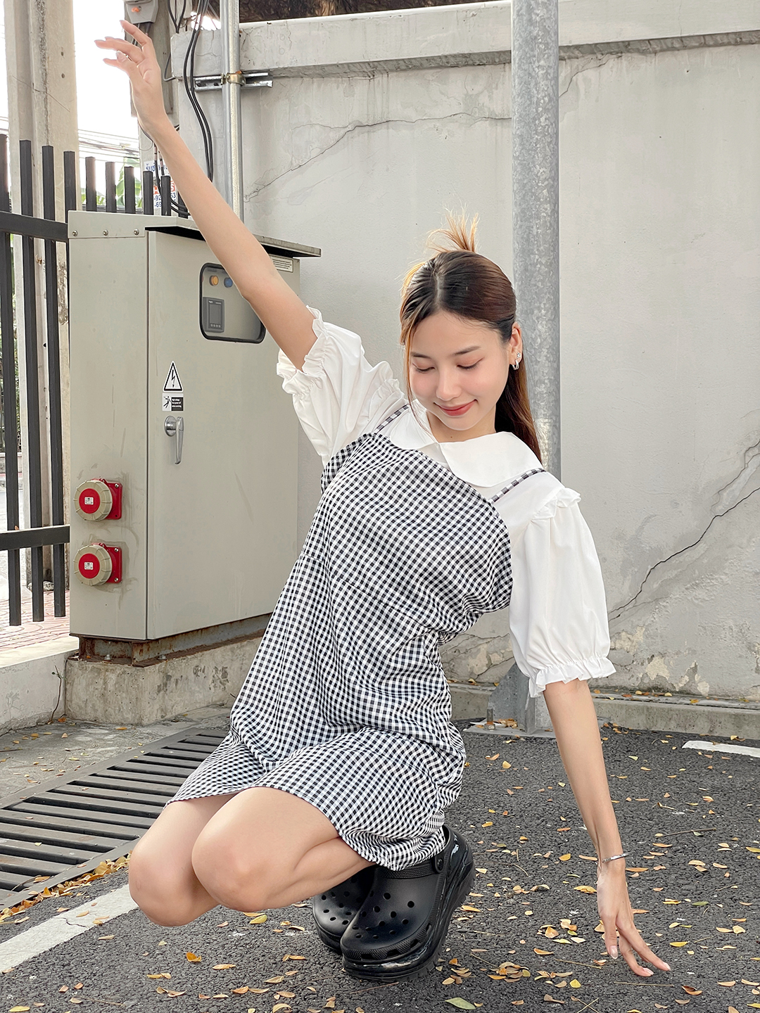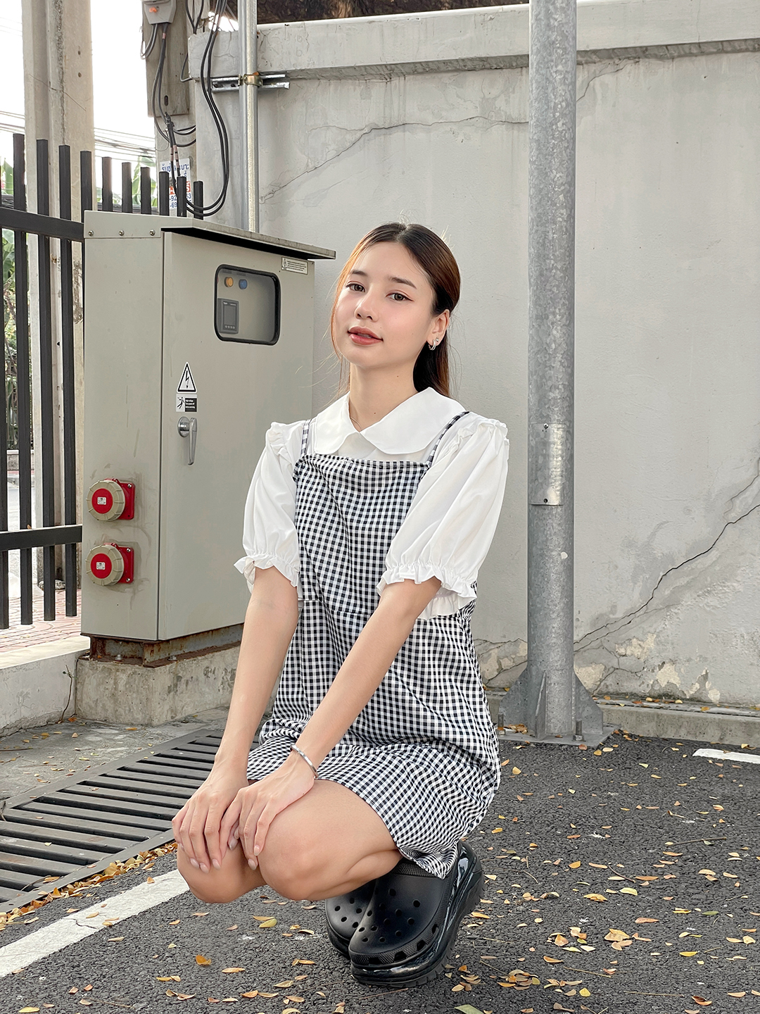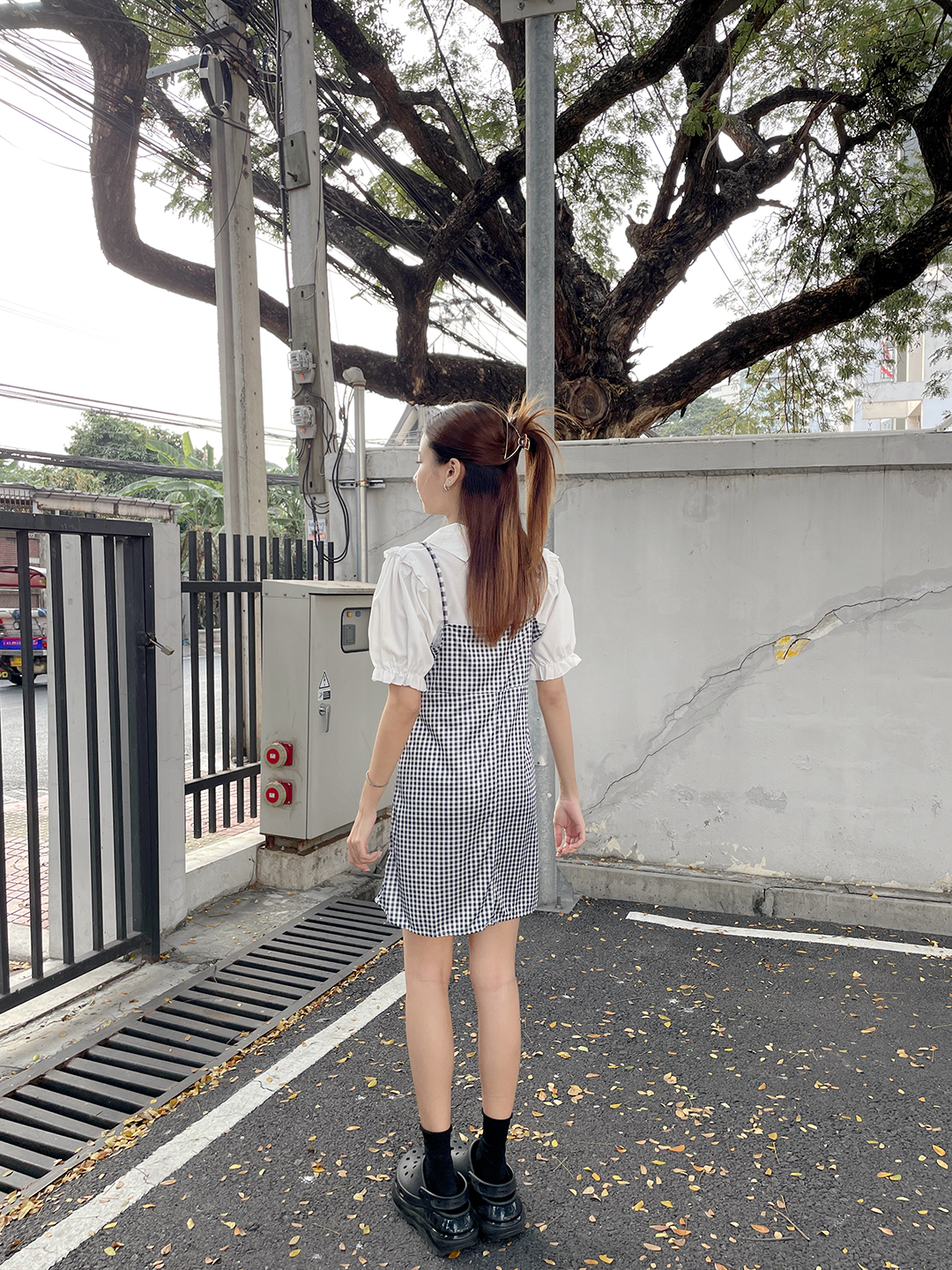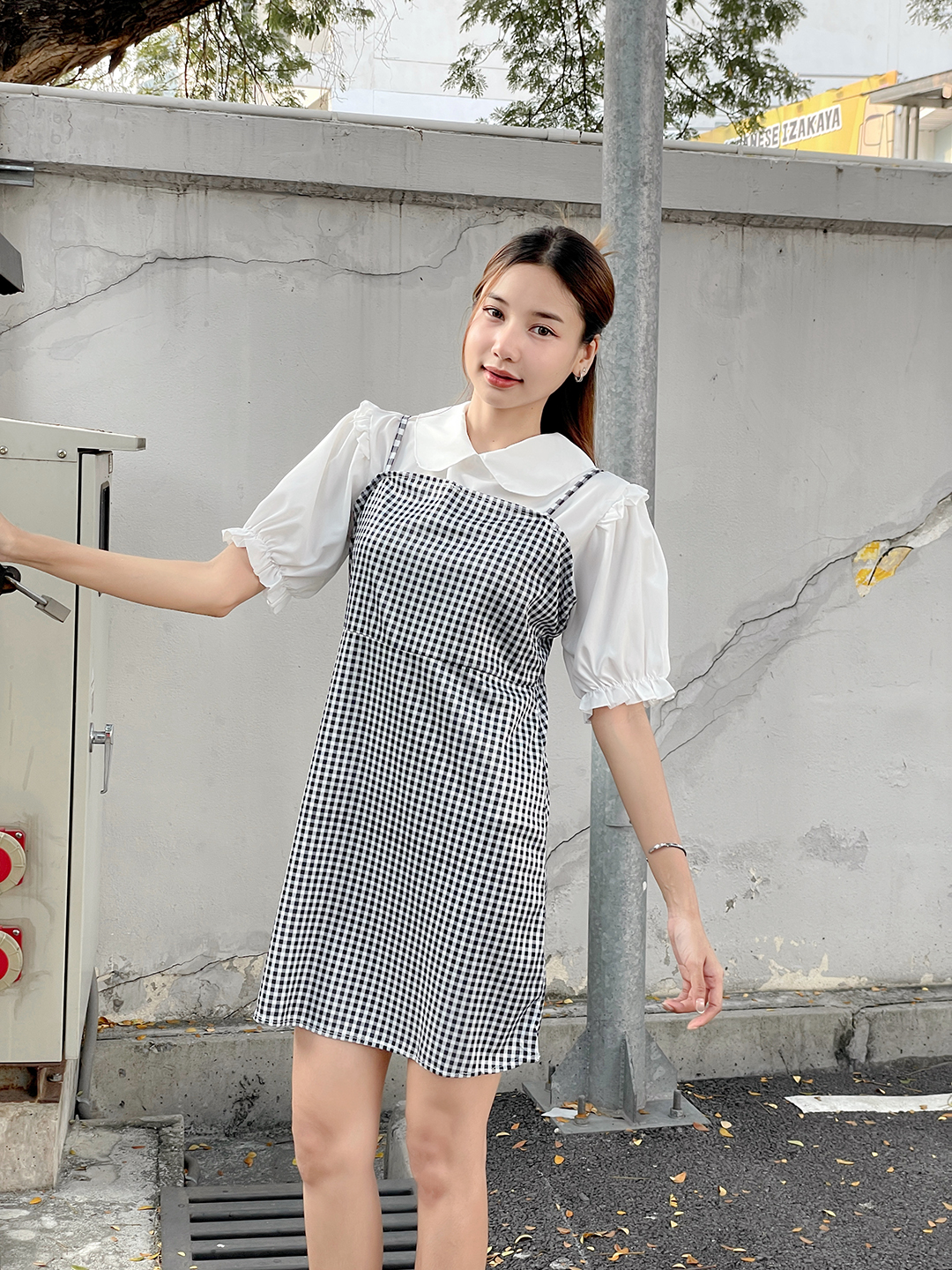 น้องรุ่นนี้เป็นเสื้อทรงเชิ้ตแขนสั้นพร้อมระบายน่ารักๆ ผ้าชีฟองเนื้อนิ่มใส่สบาย แมตช์กับเดรสตัวนอกเป็นเดรสสายเดี่ยว พิมพ์ลายตารางสีขาวดำสวยมาก งานดีใส่สบาย ราคานี้ได้สองชิ้นเลย จะนำไปแยกชิ้นหรือจะใส่ด้วยกันก็น่ารักมากๆ ไม่ต้องคิดเยอะแมตช์มาให้เรียบร้อยค่ะ