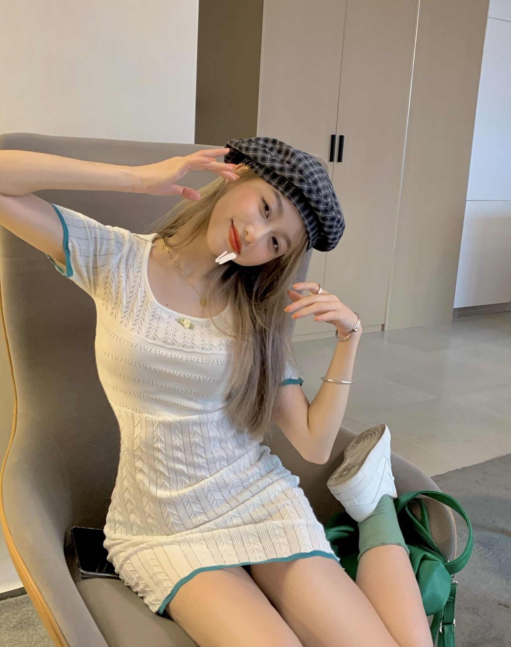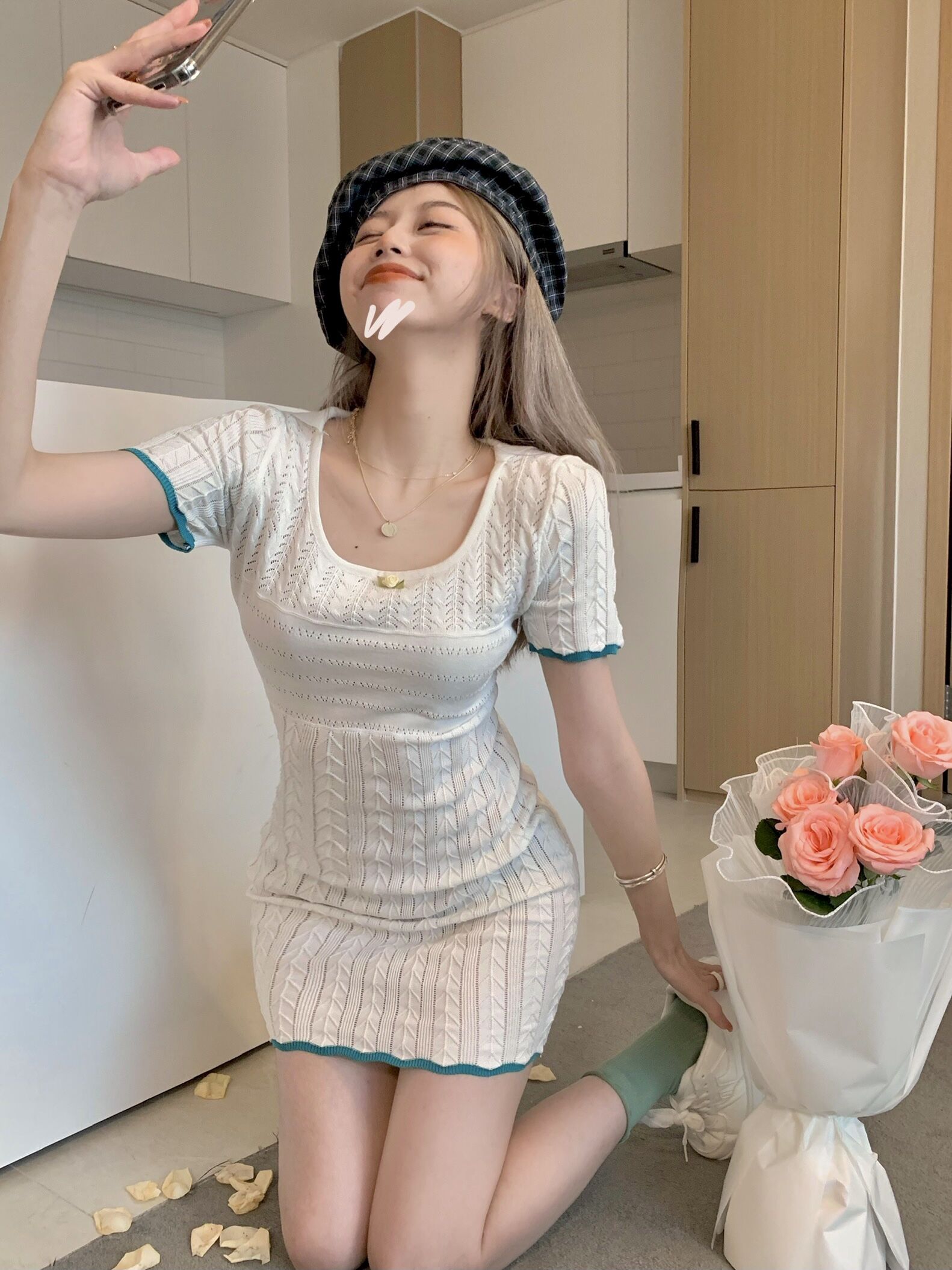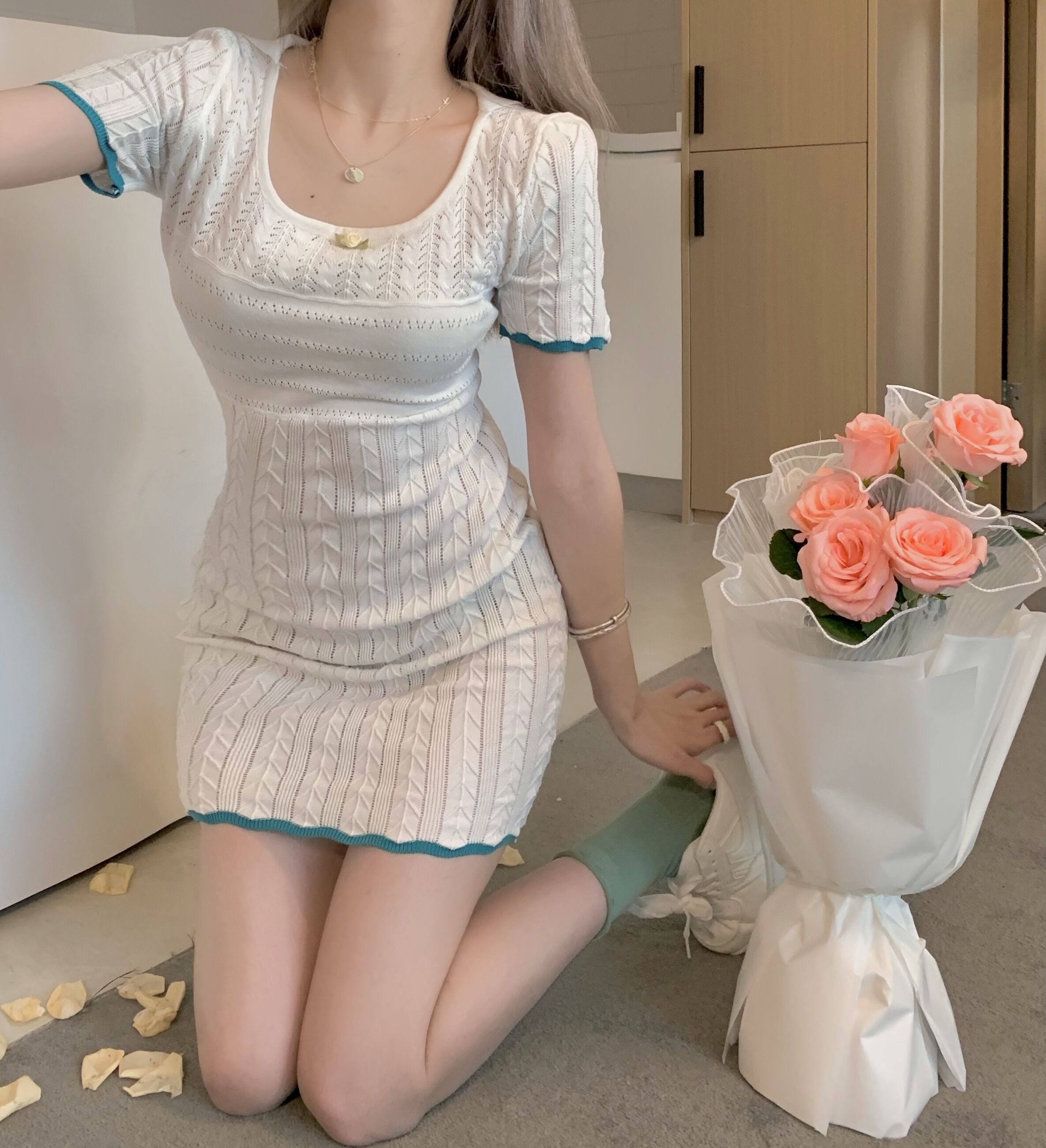 เดรสคอแลมแขนสั้นทรงเข้ารูปสีขาวงานสวย น้องจะเป็นเนื้อผ้านุ่มๆลื่นๆค่ะ ใส่แล้วน่ารักมากก |
