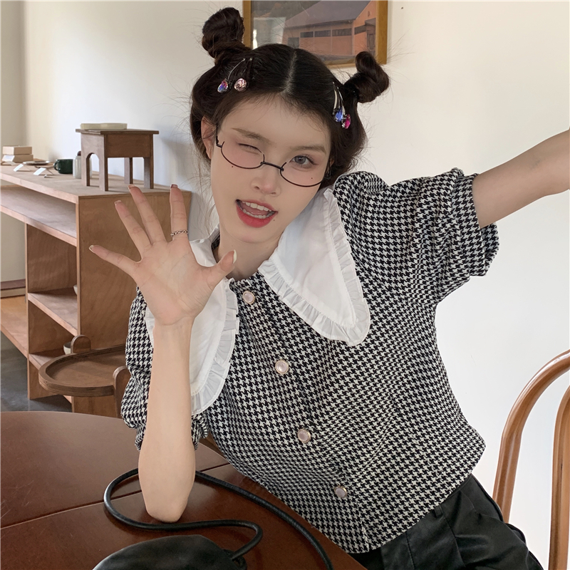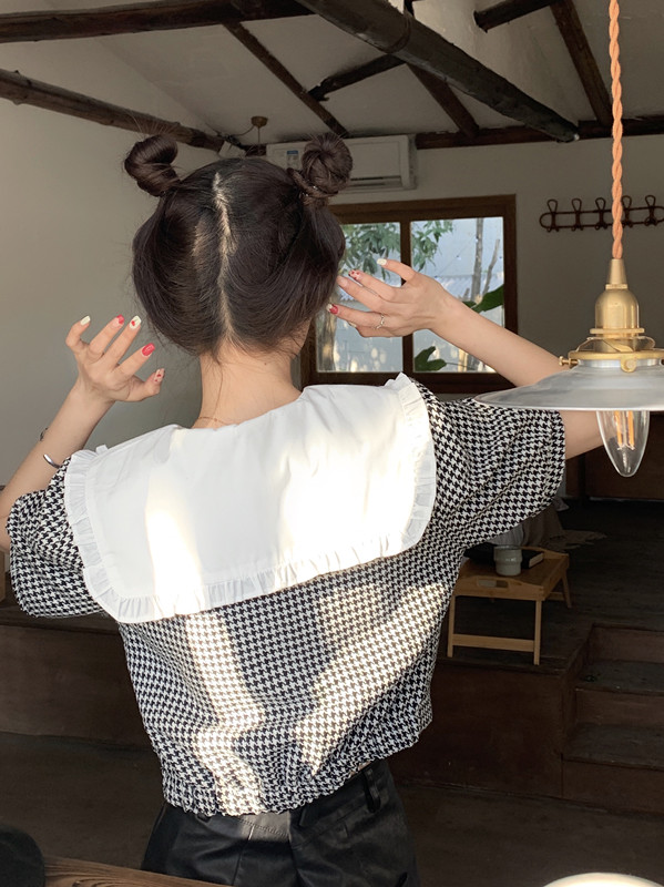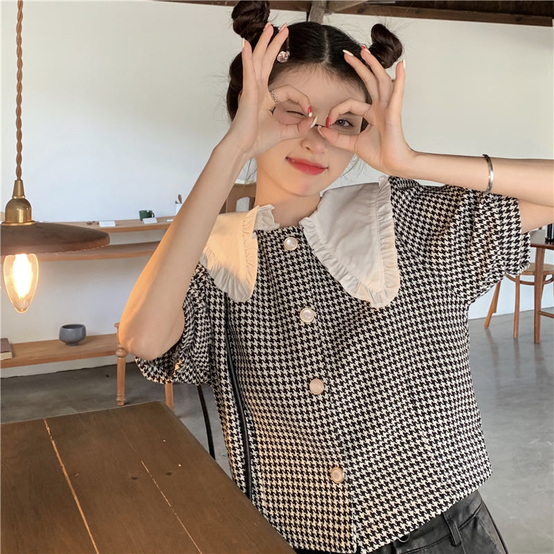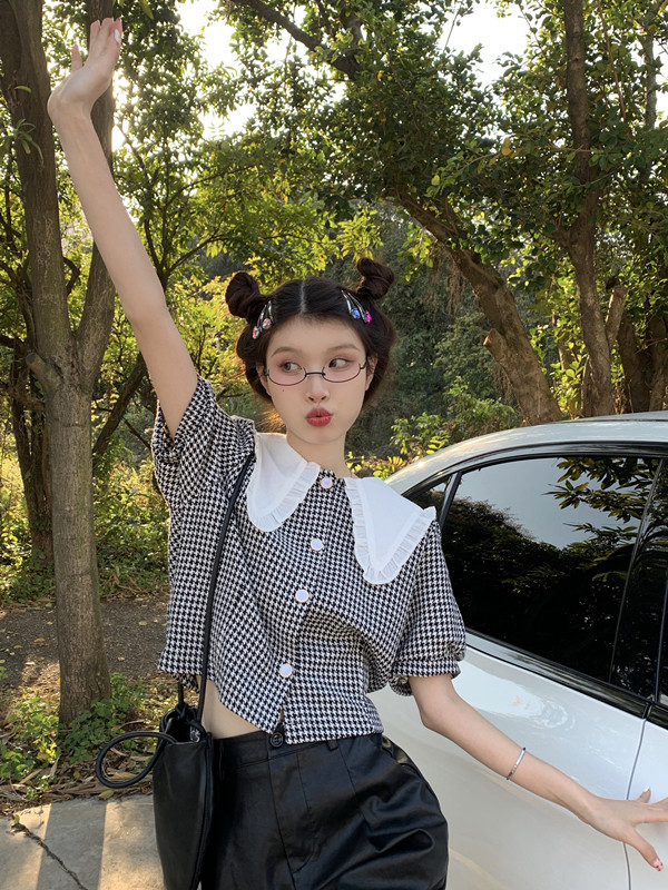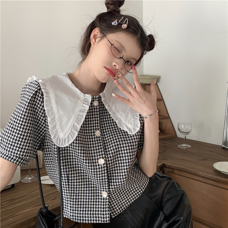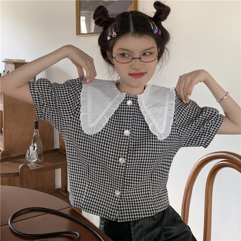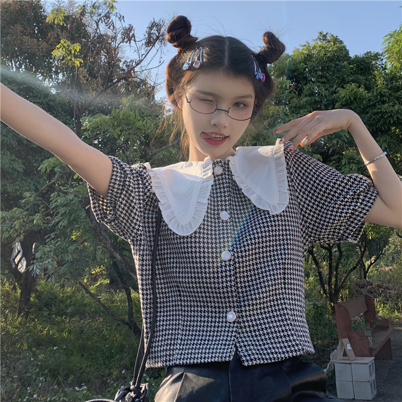 เสื้อแขนสั้นทรงครอปแต่งปกคอบัว น้องเป็นผ้ากึ่งทวีต ช่วงกระดุมเป็นกระดุมไข่มุกสีขาวสวยๆ ปกเสื้อเป็นปกคอบัวพร้อมระบายสีขาวสุดน่ารัก น้องเป็นทรงครอปหน่อยๆ เย็บเข้ารูปแบบหลวมๆ ผ้าเบาสบาย ใส่ไม่ร้อน จะใส่เที่ยว หรือใส่ทำงาน ก็ปัง |