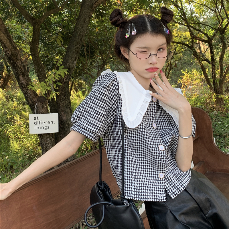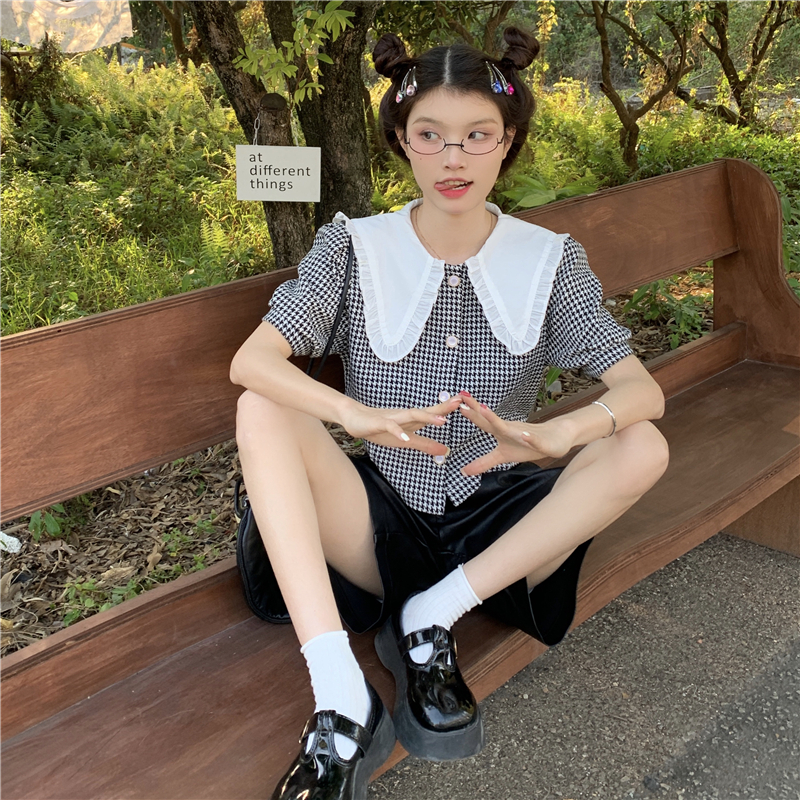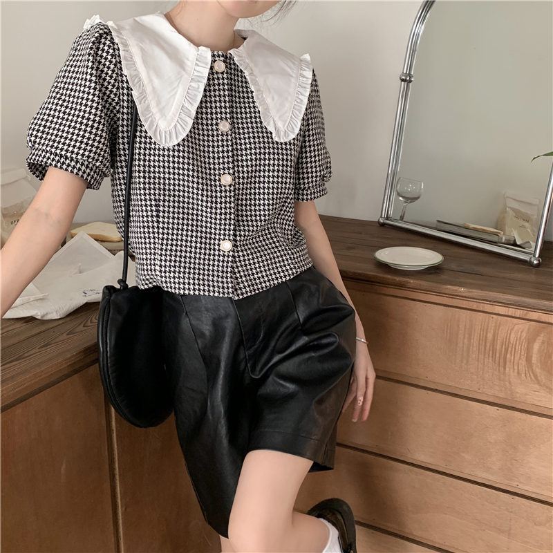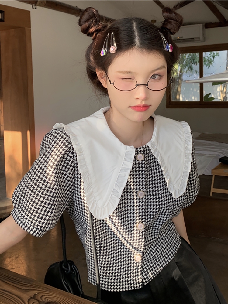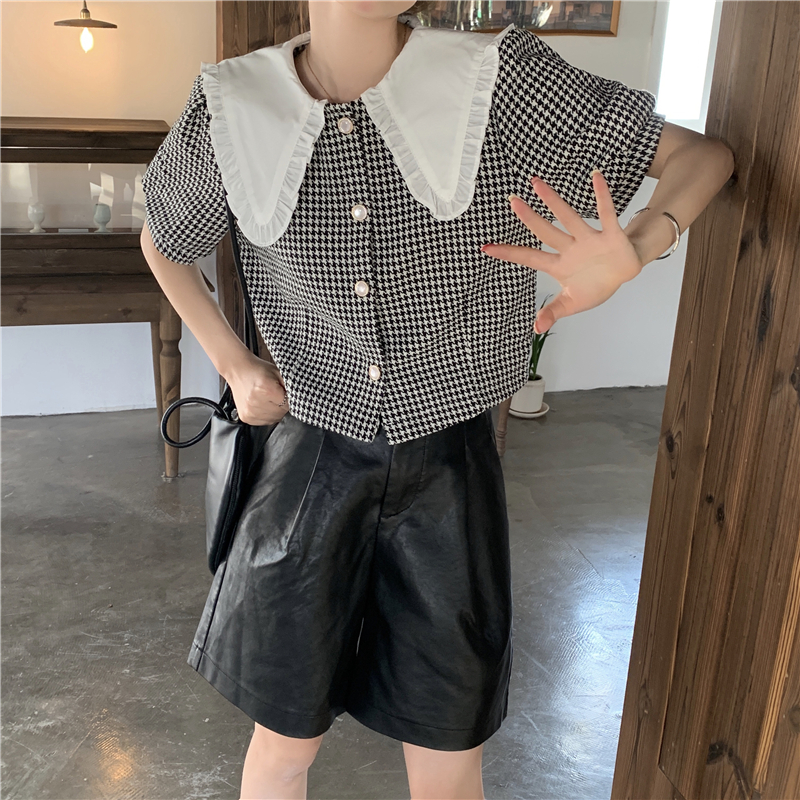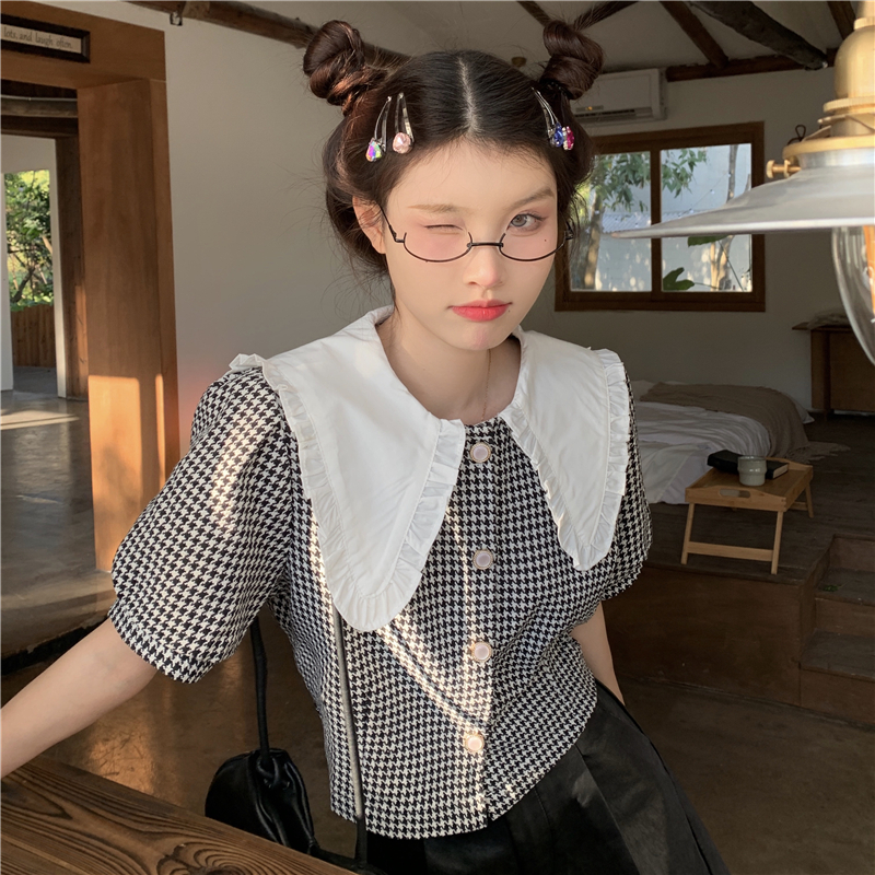 เสื้อแขนสั้นทรงครอปแต่งปกคอบัว น้องเป็นผ้ากึ่งทวีต ช่วงกระดุมเป็นกระดุมไข่มุกสีขาวสวยๆ ปกเสื้อเป็นปกคอบัวพร้อมระบายสีขาวสุดน่ารัก น้องเป็นทรงครอปหน่อยๆ เย็บเข้ารูปแบบหลวมๆ ผ้าเบาสบาย ใส่ไม่ร้อน จะใส่เที่ยว หรือใส่ทำงาน ก็ปัง |