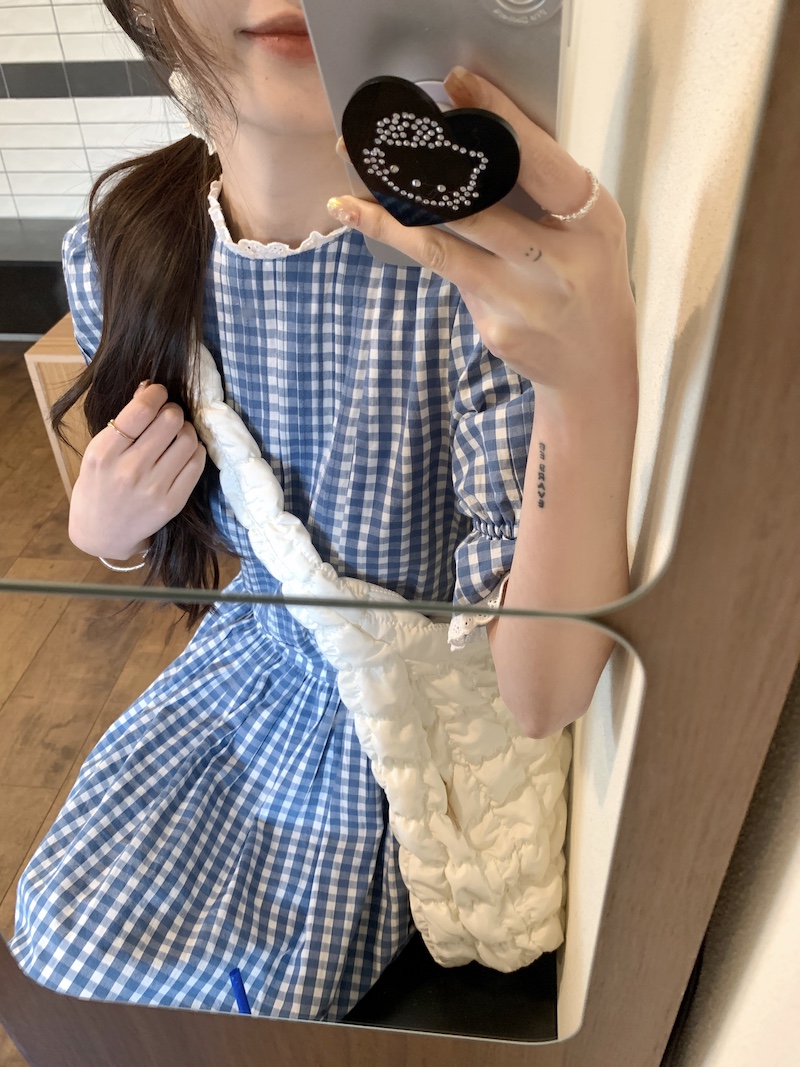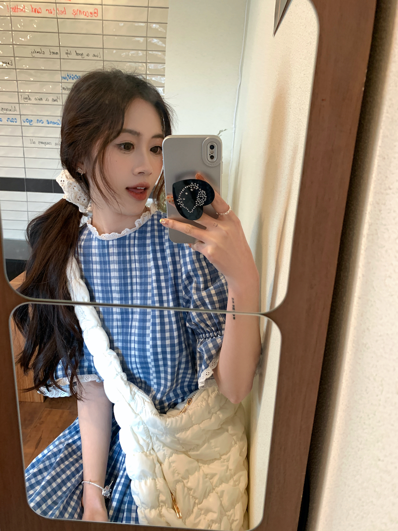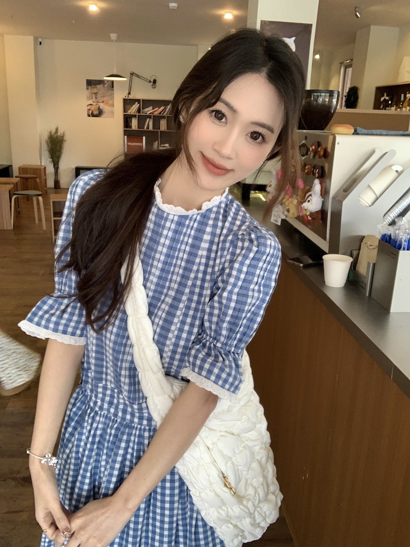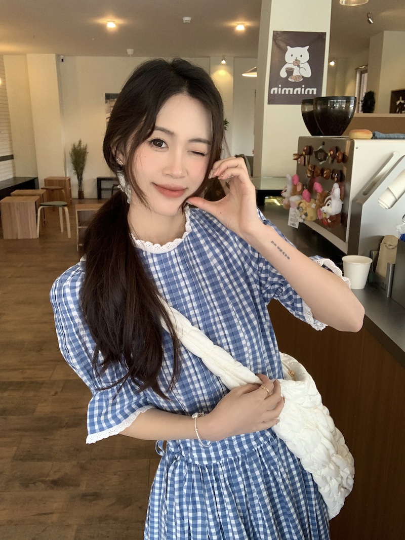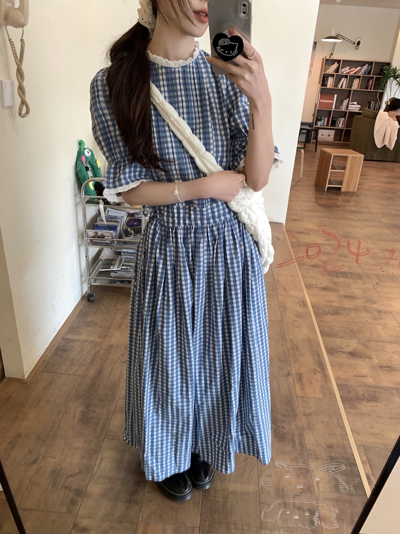เดรสคอกลมแขนสสั้นลายสก็อตสีสวยมาก รุ่นนี้ใช้ผ้าเยอะมากเลยค่า แต่แบบน่ารักมากแน่นอน ช่วงคอเสื้อเป็นลูกไม้พร้อมที่แขนเสื้อผ้าสวยมาก ปังแน่นไม่ซ้ำใคร